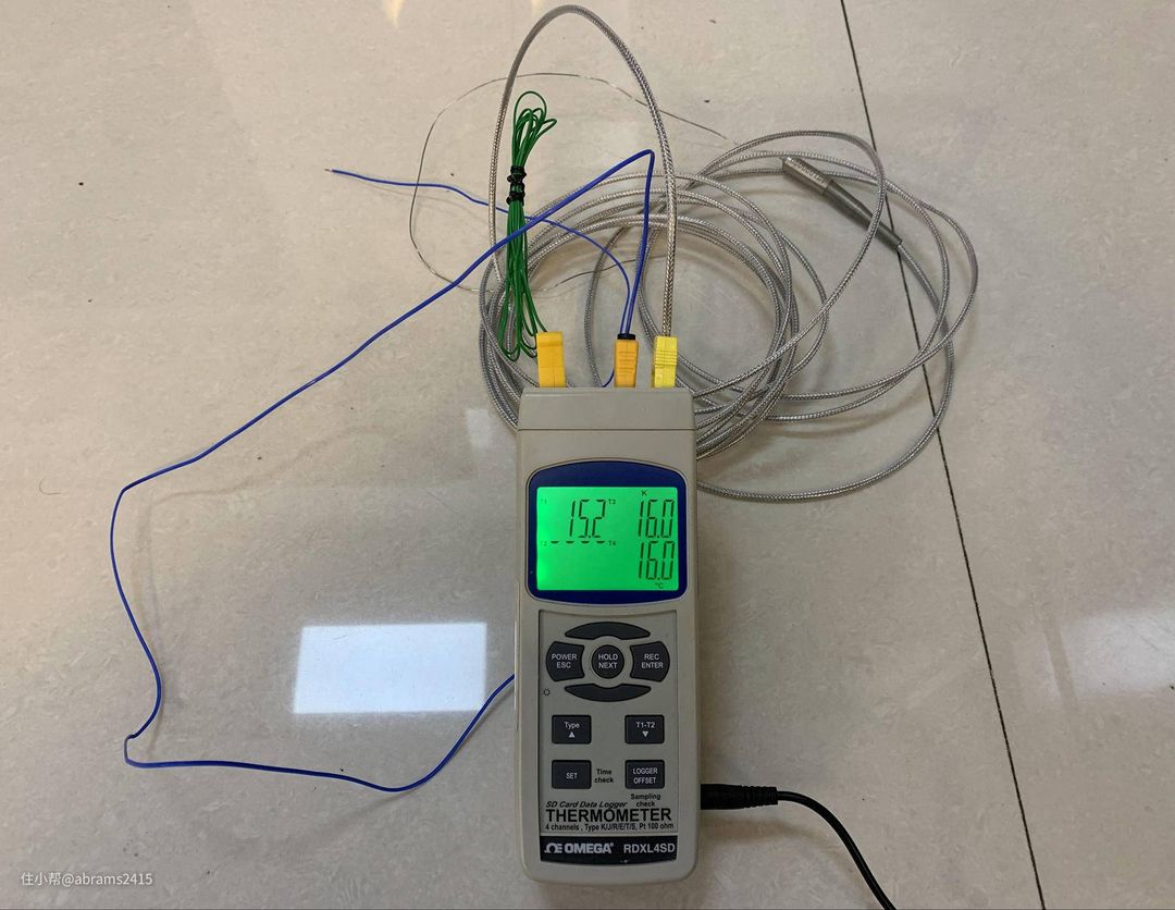 ▲美国OMEGA四通道温度记录仪,在1,3,4通道插了3个K型热电偶探头。温度基本相同,所以选择第三通道记录内腔实时温度变化