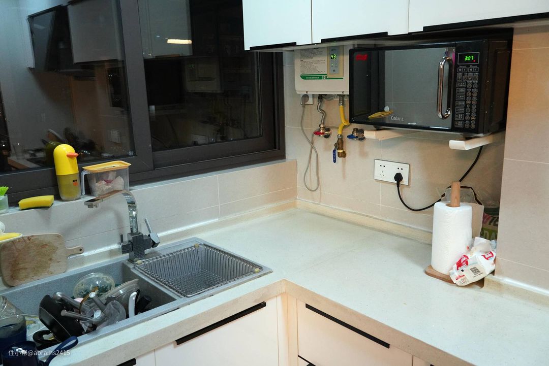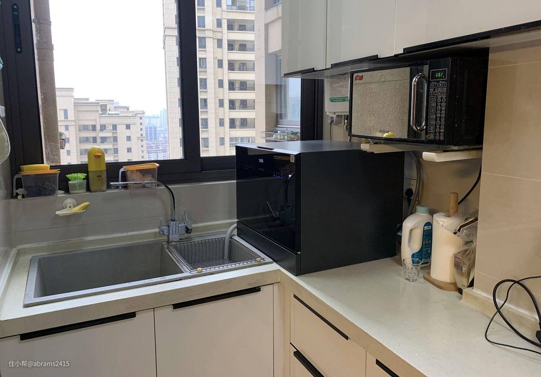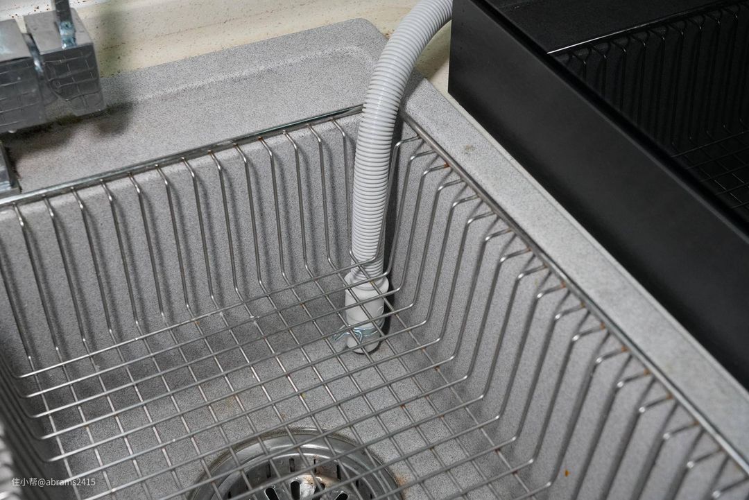 ▲台式洗碗机不需嵌入,因此只需有个进水和排水地方就行。一般放在台面上打孔从下往上引入进水,不想台面打孔的也可以直接连接在水槽的进水水龙头进水。但楼主这块区域天生设计时就考虑到台式洗碗机摆放,因此进水可从燃气热水器进水端引入,排水直接往水槽内排就OK了