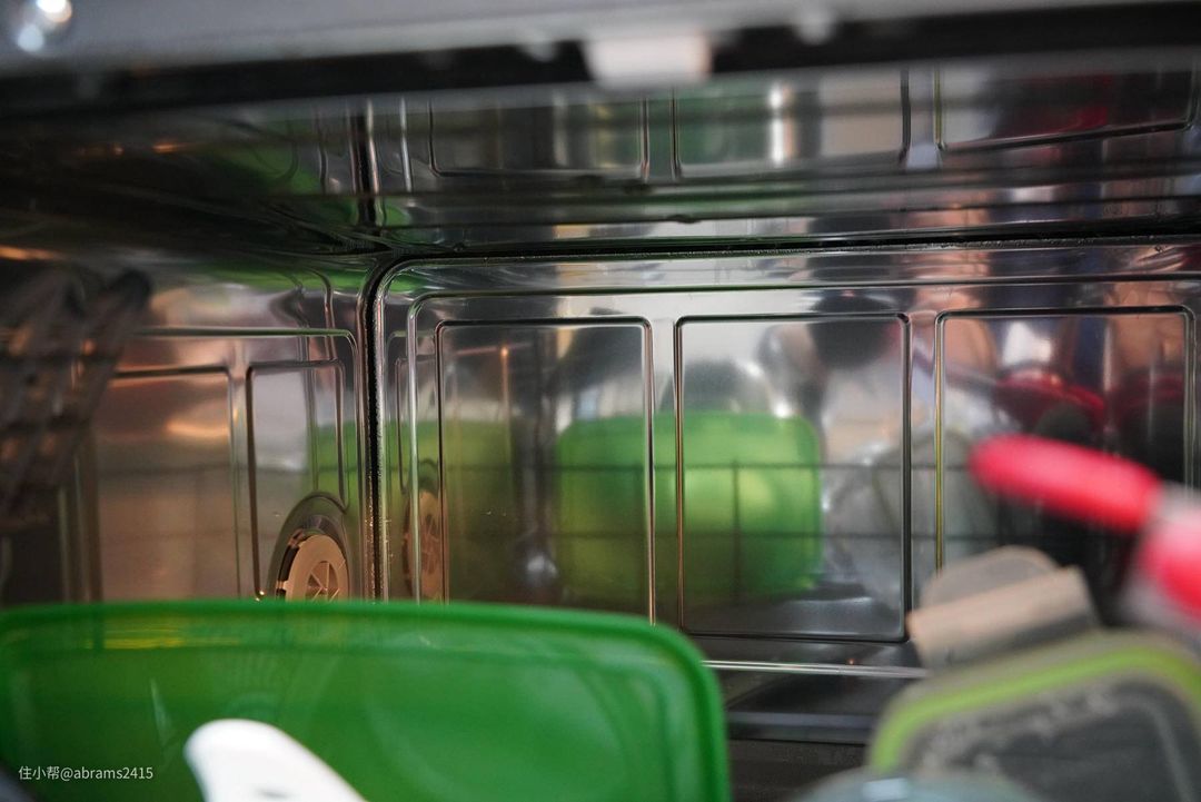 ▲这台西门子台式洗碗机采用余温+冷凝的烘干方式,具体来说就是在最后一遍漂洗时提高水温至70℃左右,碗碟散发出的湿气碰到和外接相通的不锈钢腔壁后凝结为水珠。从实际效果来看,程序完成后打开观察餐具基本能烘干,且不锈钢内壁上没有水珠凝结。但洗后要及时开舱门,不然底部、喷水摇臂内的水份会重新让腔内产生水气