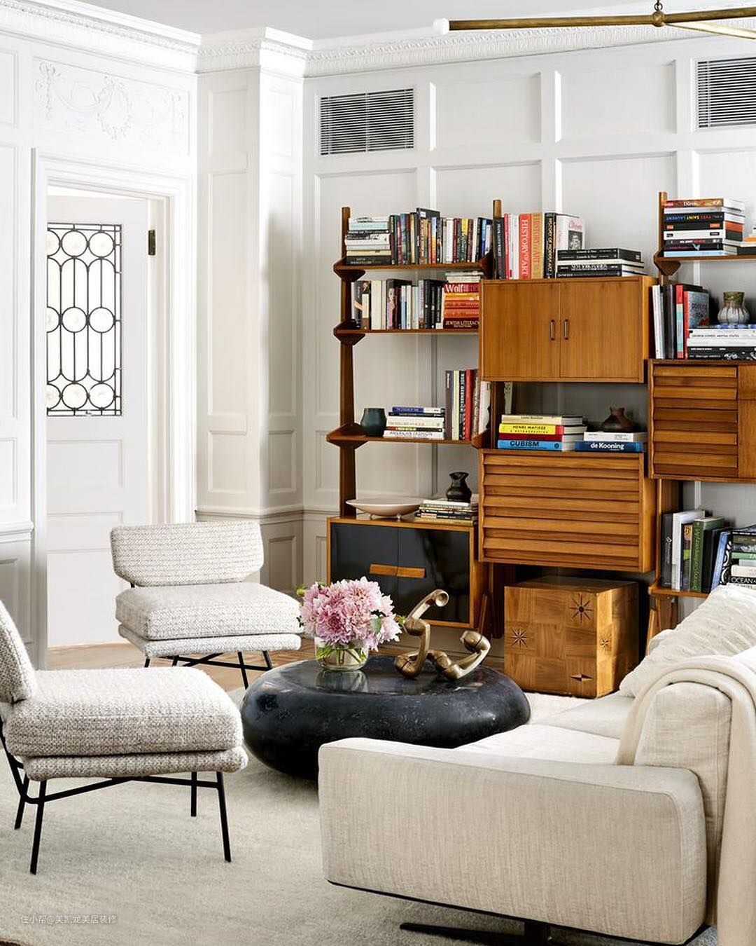 第三款:直接在沙发旁,放一组原木色书柜,半开放式,书籍不多的情况下,可以随意自然搭配摆放,不建议将书架塞得太满,特别是书柜放在客厅时,大大减少空间美感。