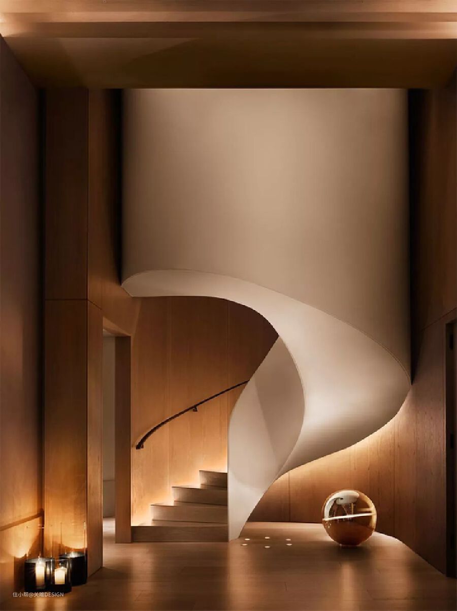 曲线自带着它的优雅,旋转的几何美感,有一种特殊的魅力,原木色的楼梯搭配上一体化的曲线扶手,宛如一条优美的丝带,真的把人带进了艺术的天堂。