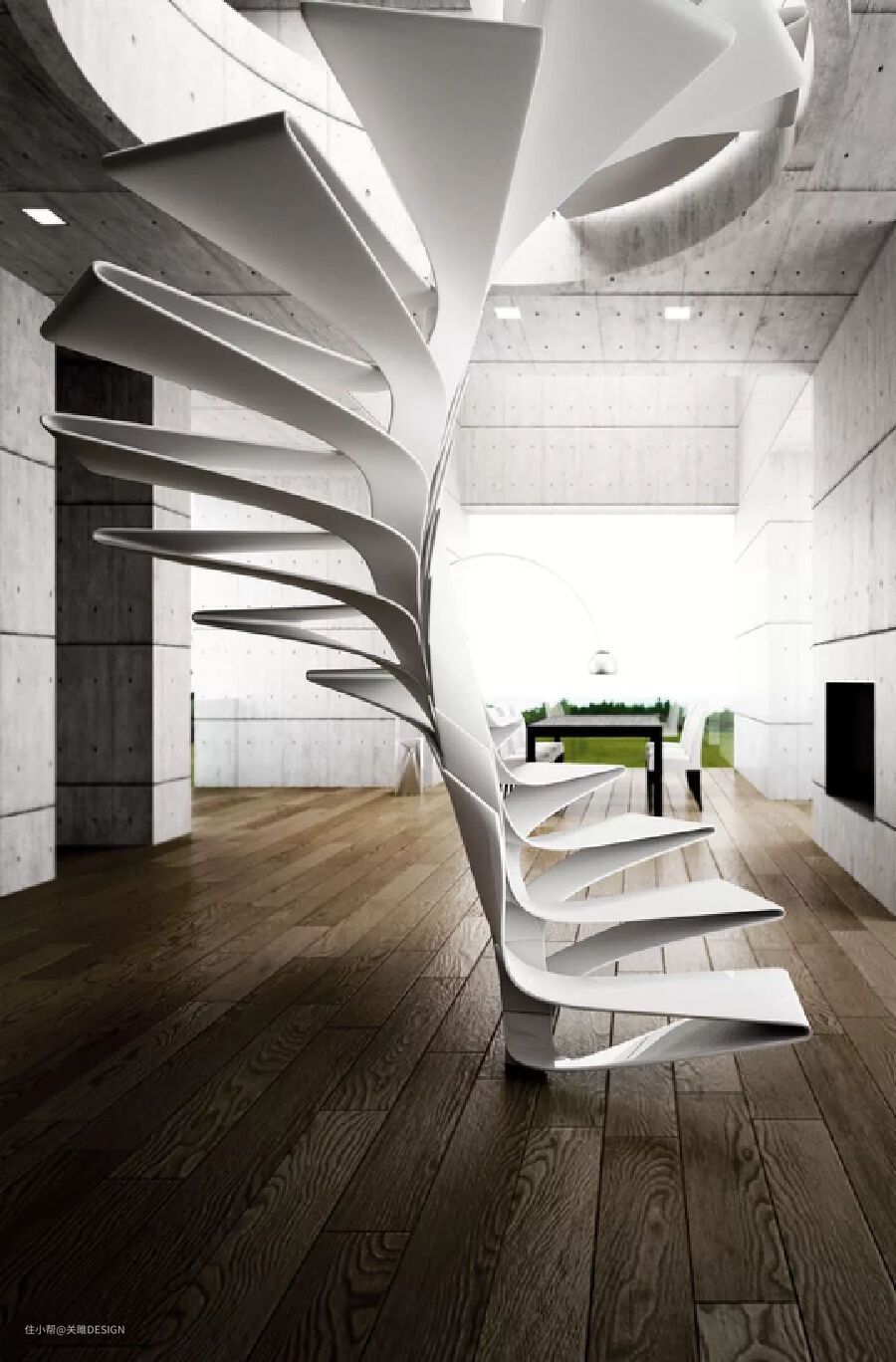 这是款以花瓣为灵感的旋转楼梯,经过特殊处理的圆弧木色踏板盘旋而上,如流光飞舞,俯瞰就像花朵一样绽放,形式和功能的完美体现。