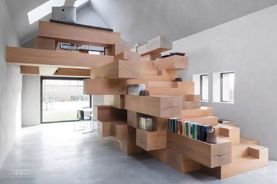 层次感十足的外观设计,给人强大的视觉冲击力,巨大的木条将楼梯分隔的像积木一样,木条之间是存放书籍的完美所在。