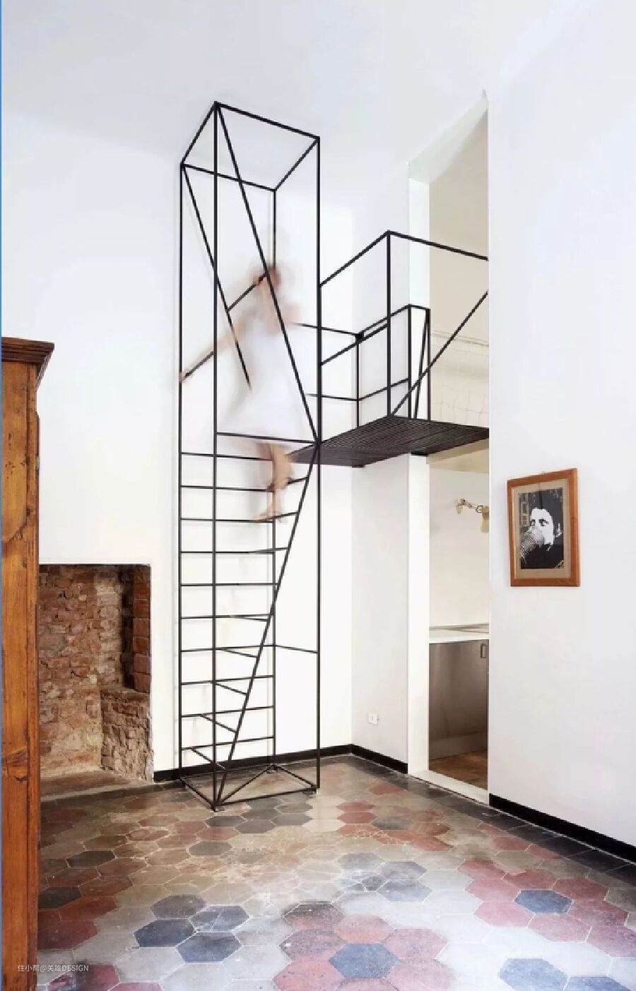线框型楼梯位于米兰一间翻新公寓内,由 Francesco Librizzi设计,充分利用高度上的空间,把公寓隔成两个楼层,提高空间使用率,骨感又酷炫。