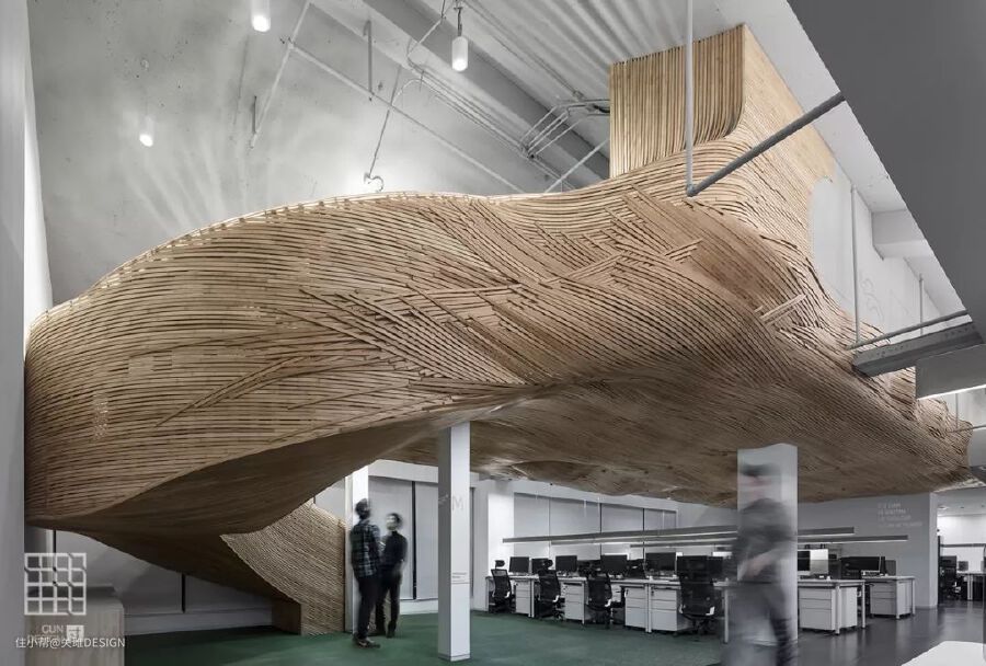 设计师充分利用木材的可塑性,反复排列叠加扭曲,最终形成犹如大海的波浪一般的表皮艺术,充满了魔幻力,带来惊艳的视觉效果。