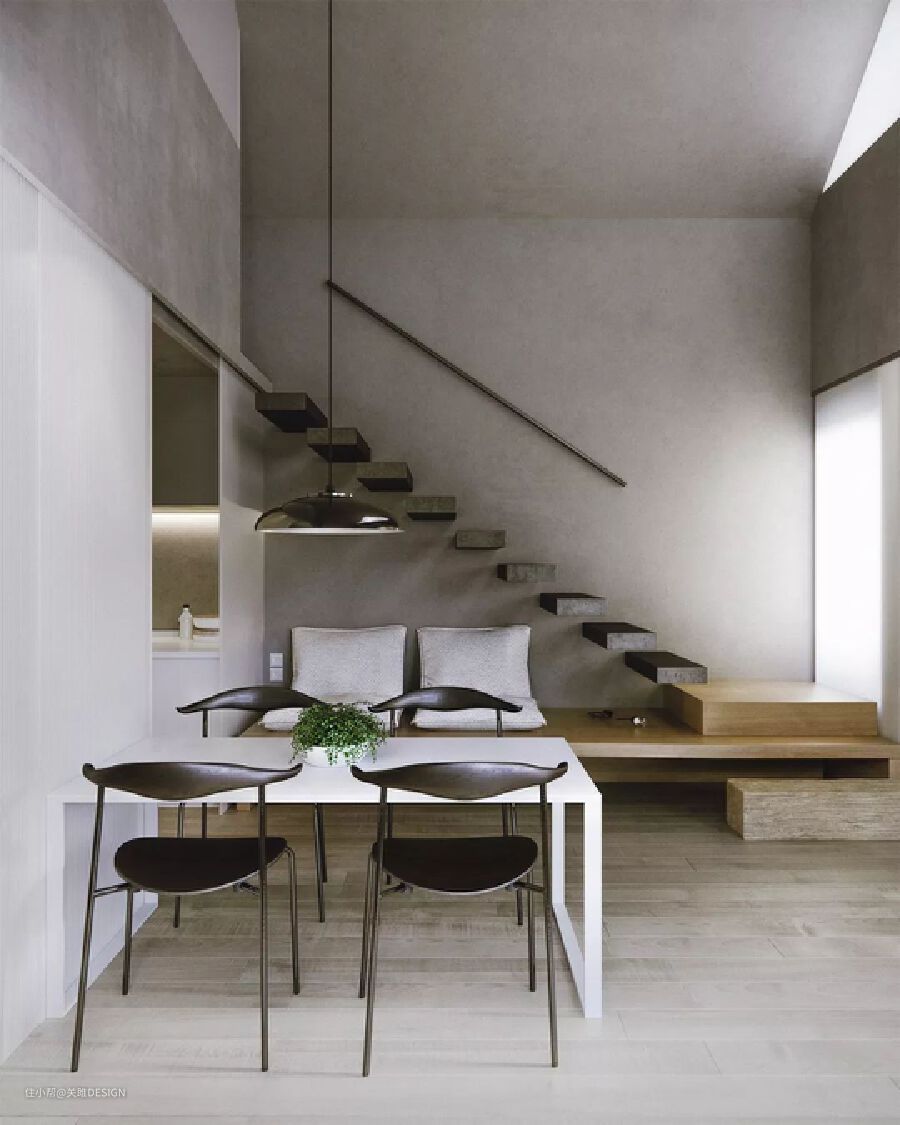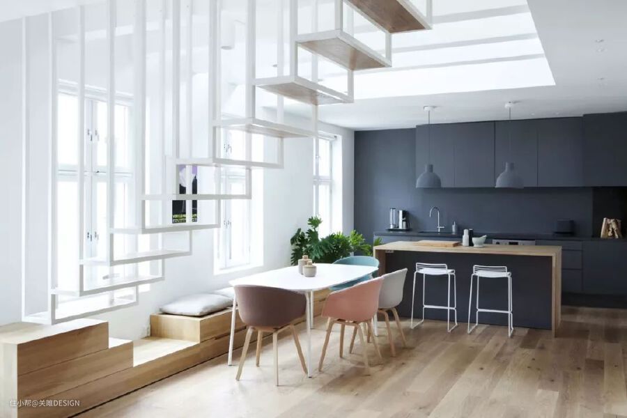 这个公寓位于哥本哈根一座工厂内,最吸引人的是在空间中漂浮的楼梯,一个长4.5米的悬臂式长桌一直延伸至楼梯,由轻质钢结构组成的踏板,搭配抛光的白色水磨石,给人精致,轻盈感。