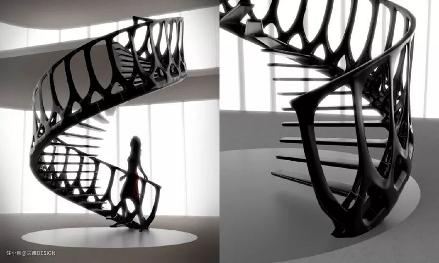 这个概念楼梯是由加拿大建筑师Andrew McConnell基于鲸鱼的脊梁为灵感,将鲸鱼的脊椎骨简化为一个单一的组成部分,一块脊椎就是一步台阶,通过台阶和仅有一侧的扶手部分连接起来,盘旋而上,不仅组装简单,也有如鲸鱼身体一般的负荷力,简直不能再帅气了~