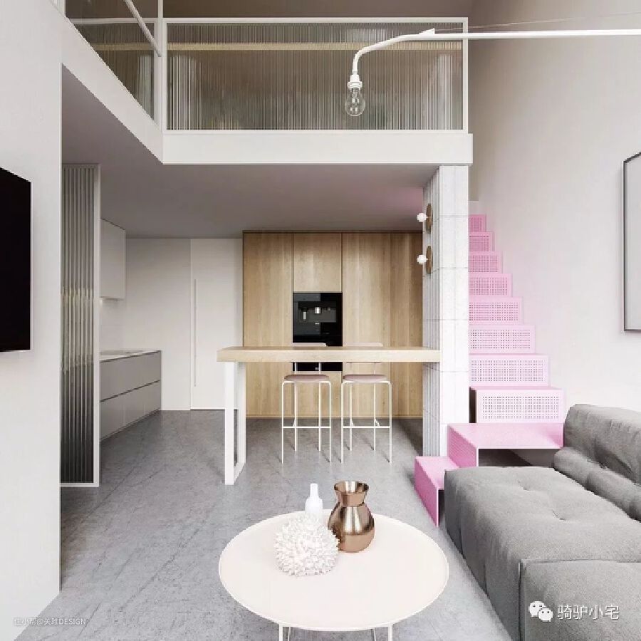 这是一个极简风格的空间,设计师使用了贯穿楼层的钢制楼梯,漆成活泼可爱的芭比粉,成为室内最大亮点,楼梯做了穿孔、边角圆滑处理,更显得精致个性。