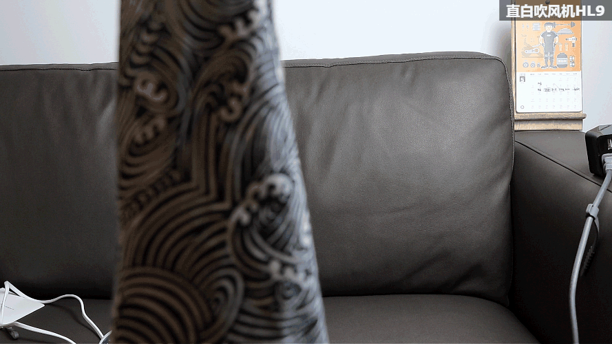 因为手里没有风速计,所以只能用这块背景布做演示当作风量大小的参考了。下图为直白吹风机HL9最大风速挡位时的效果。