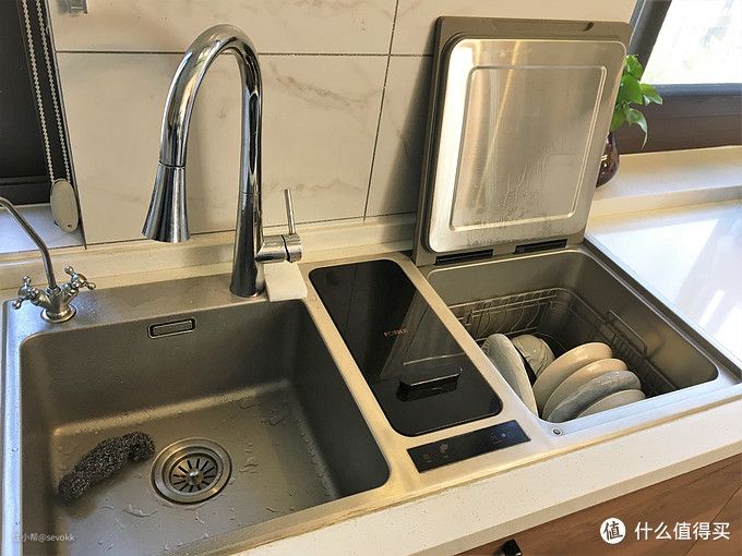 对于装修前没有考虑嵌入式洗碗机的用户,迫于厨房空间和水路的限制,很多会选择台上式洗碗机。但是台上式洗碗机会侵占正常的料理台面面积,上下水管路裸露不美观,而且容量也很小。这对于注重美观、实用方面的用户是比较尴尬的。水槽洗碗机能很好的解决这一问题,只需替换掉普通水槽,颜值确实比较高,安装好后会发现厨房台面更漂亮了,而且洗碗机与水槽一体式的设计,处理餐具里的实物残渣也更方便顺手。
