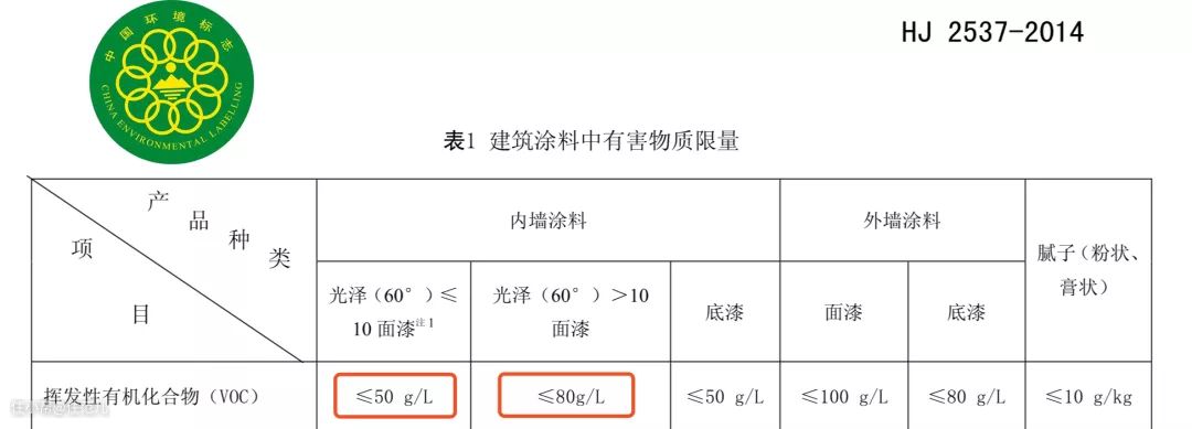 另一项指标来自中国环境标志,也就是十环认证(≤50g/L或≤80g/L),对VOC的含量要求严格一些。参照的是环境保护部发布的HJ 2537-2014《环境标志产品技术要求 水性涂料》。