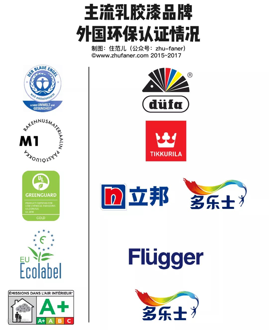 上 以上是拿到德国蓝天使、芬兰M1、法国A+、绿色卫士金级和欧洲之花的主流涂料品牌 图源:住范儿自制