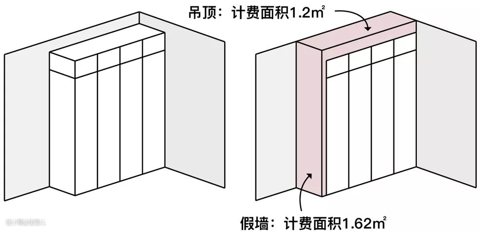 以2.7米的层高、2米宽的柜子计算,搭建假墙和吊顶增加的基础施工费用只有500元不到。