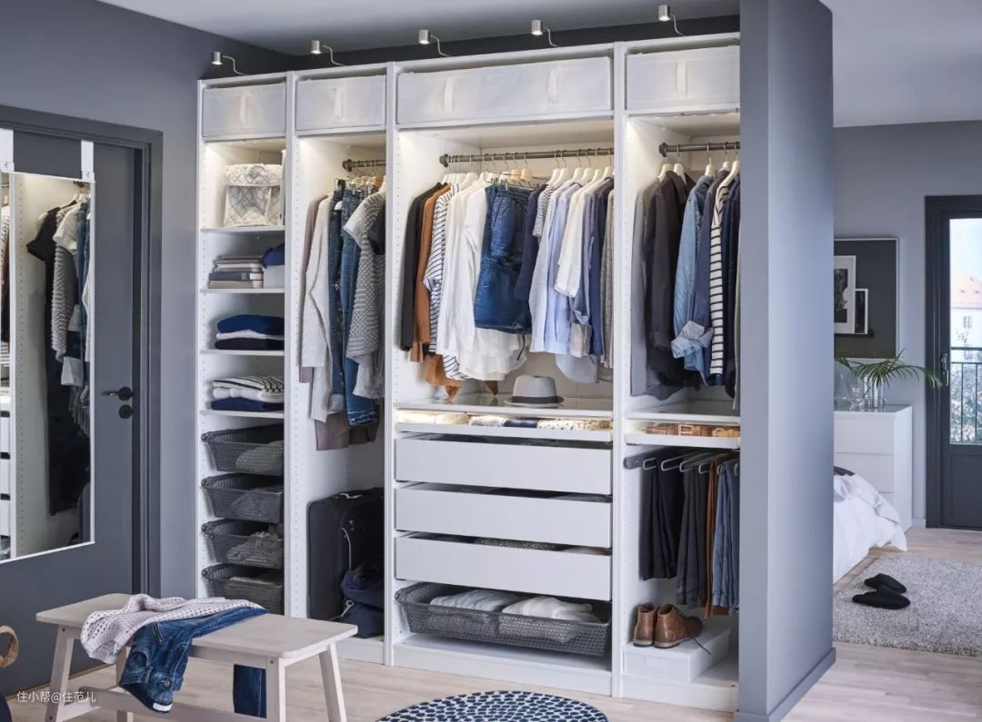 宜家的PAX是成品衣柜里最高的,能做到2.3米,再加个40厘米高的顶柜,轻松顶到天花板,和定制衣柜完全没差。