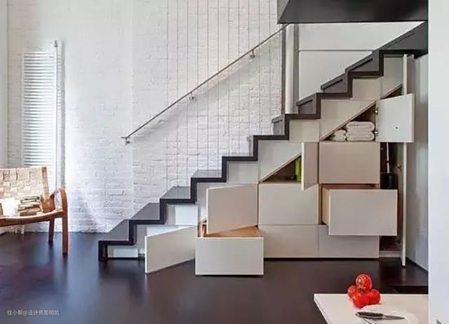 有限的小户型空间需要更多的收纳,而将楼梯踏步设计成带抽屉的样式,既满足了上下楼梯的踏步需要,又能收纳各种杂物,一举两得~