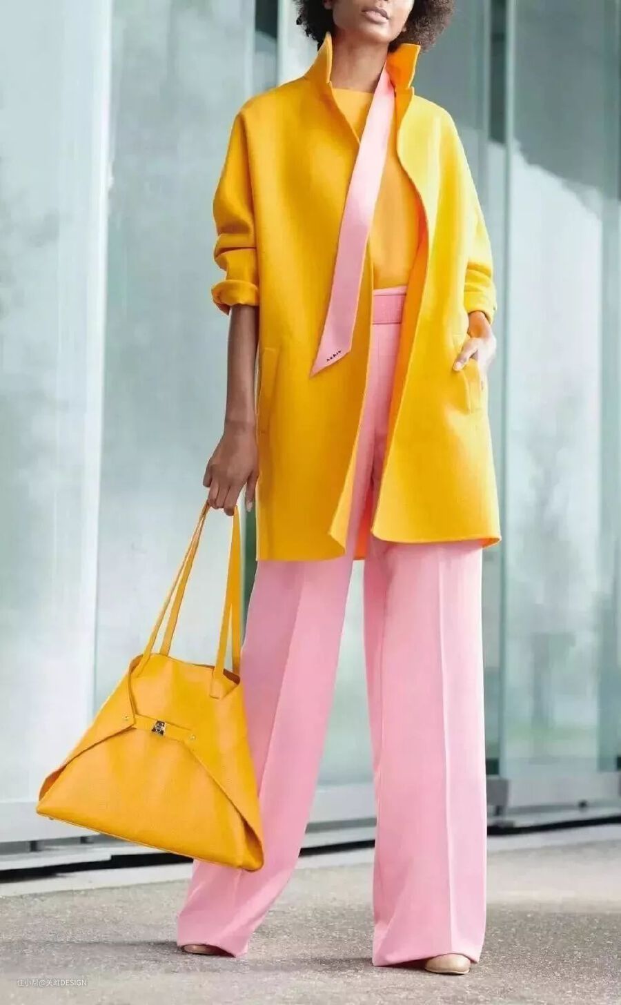 黄色本身饱和度已经很高了,这时候搭配中性的白色便能为造型带来一点喘息的空间。