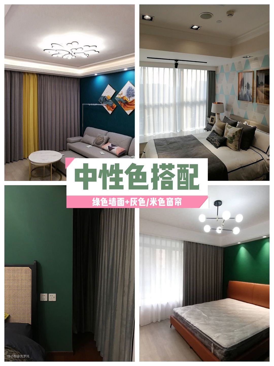 二、中性色搭配——绿色墙面+灰色/米色窗帘
