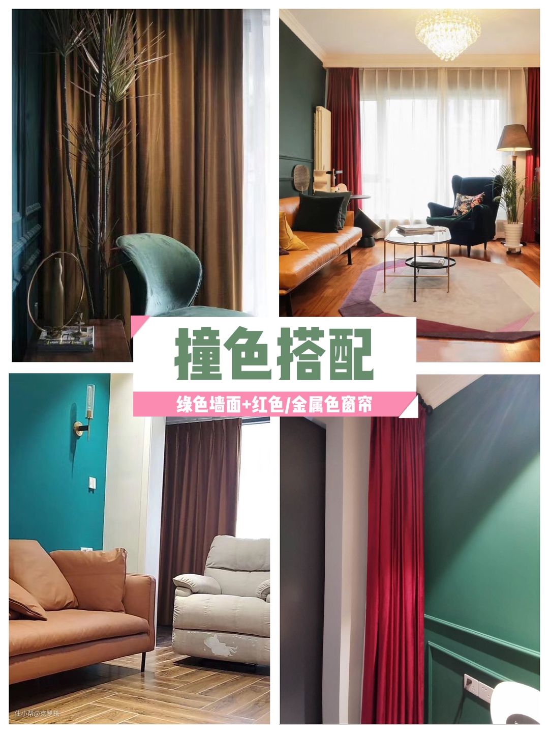 四、撞色搭配——绿色墙面+红色/金属色窗帘