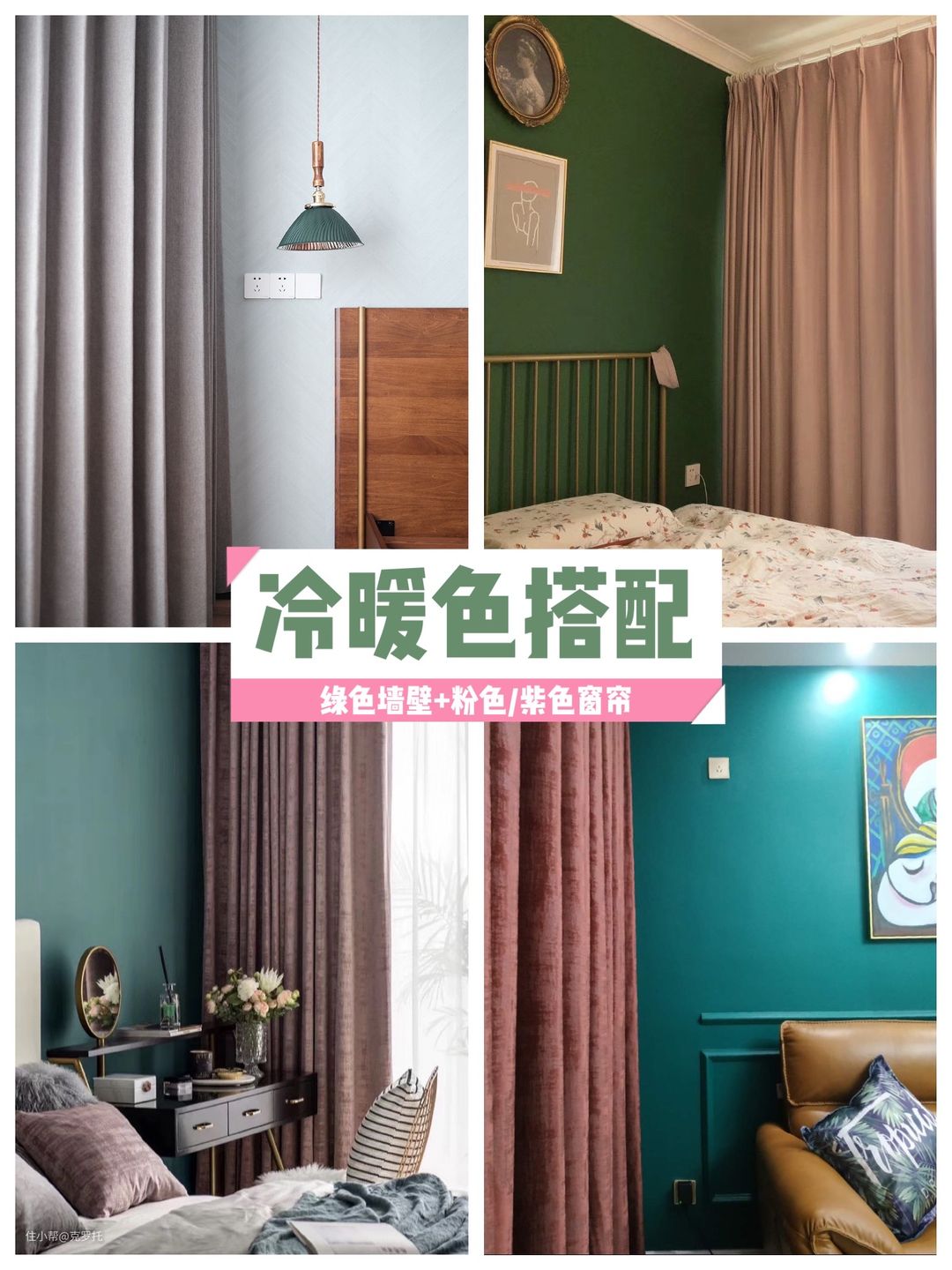 三、冷暖色搭配——绿色墙面+粉色/紫色窗帘
