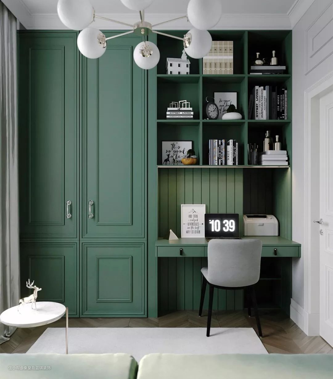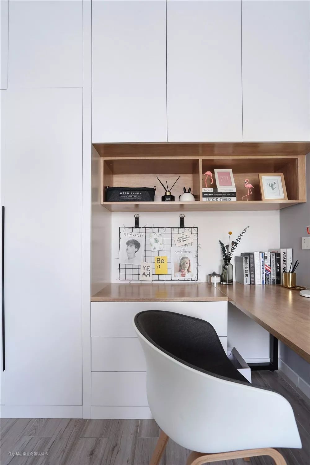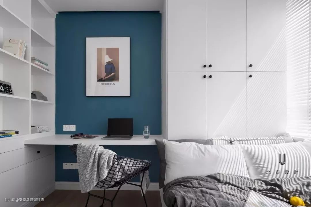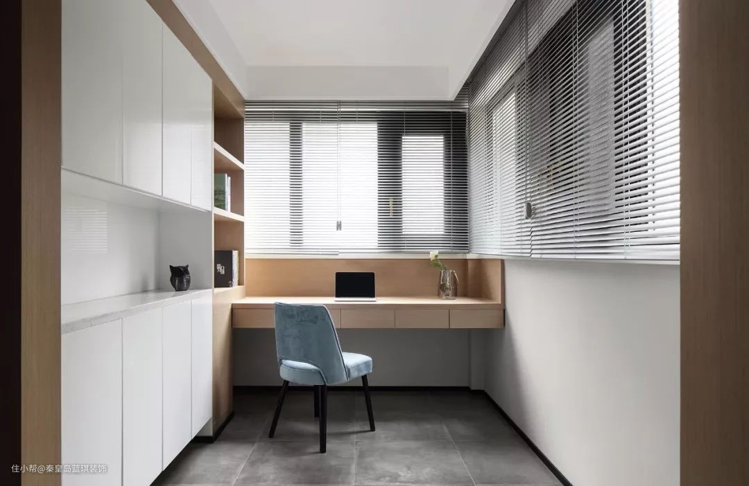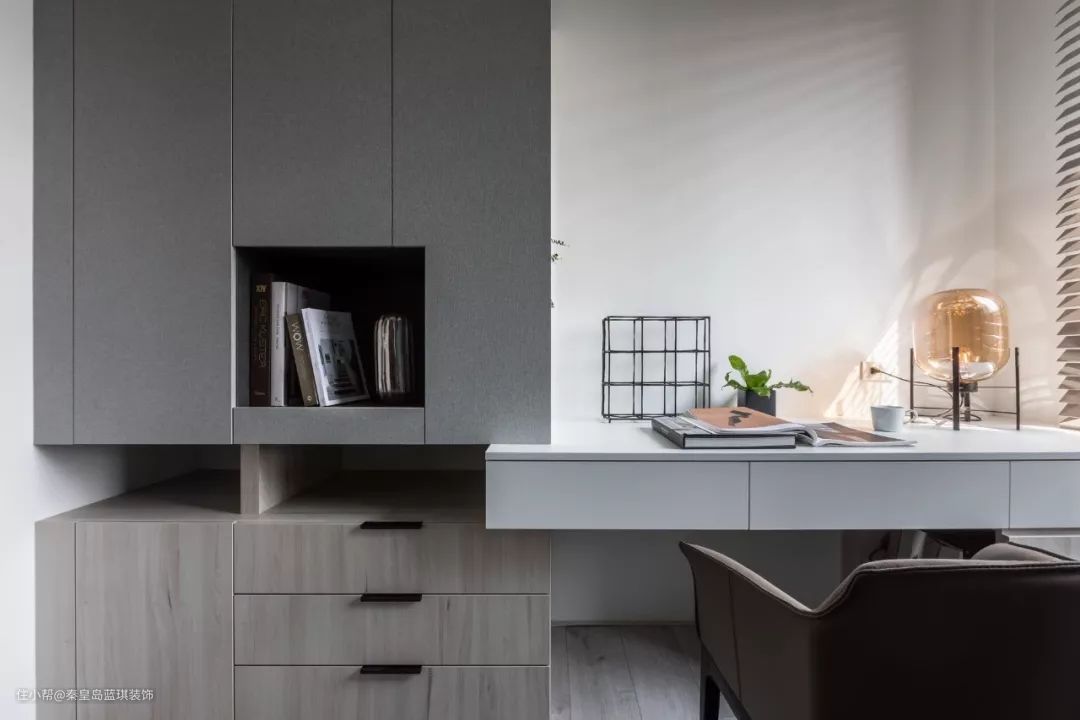 在定制收纳柜的末端,交错地装上书桌,这样让空间的利用更加透彻,最大化地实现收纳与办公的空间。