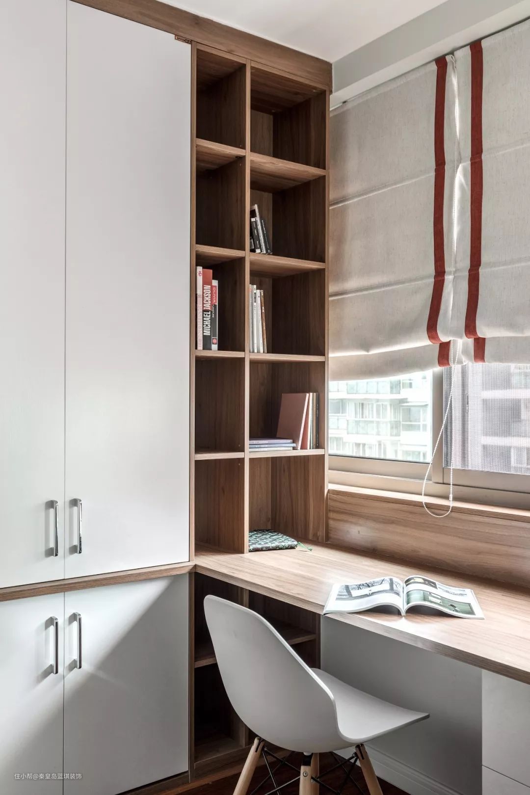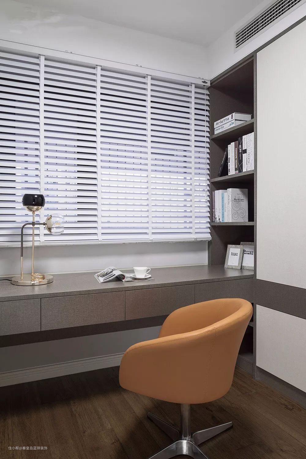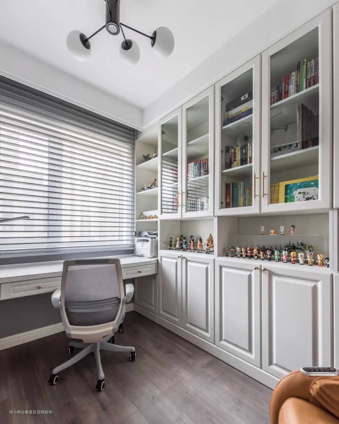 在定制收纳柜的末端,交错地装上书桌,这样让空间的利用更加透彻,最大化地实现收纳与办公的空间。
