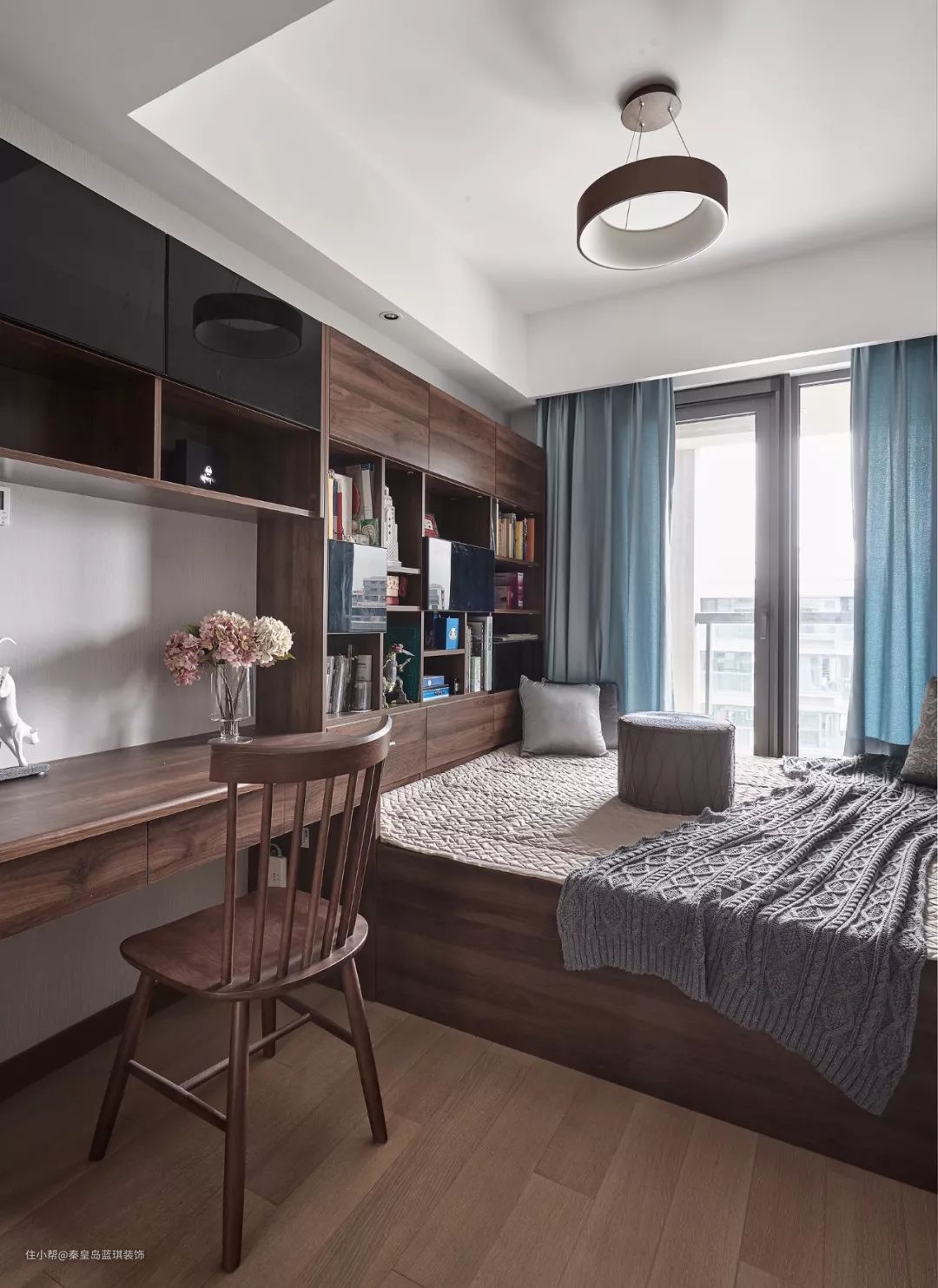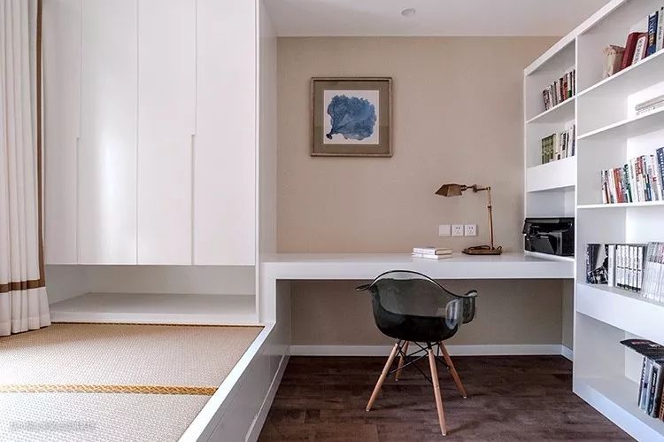 把书桌与榻榻米床结合起来定制,这样中间就没有浪费的位置,空间利用更加全面完整,这种设计相信大家都见得比较多了。