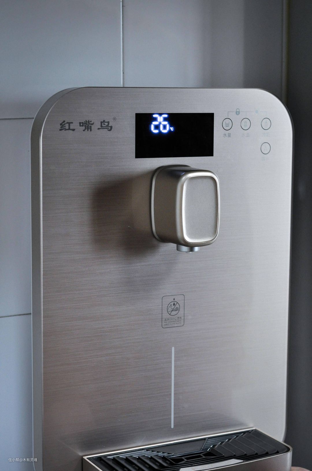 真正上墙了之后其实颜值还不错,除了logo有点过于接地气外,拉丝香槟色面板还有几分洋气。产品表现依然不错,快速出水、温度精准、最重要的是喝起来没啥塑料或者铁锈的异味,喝水这事,越来越简单了。