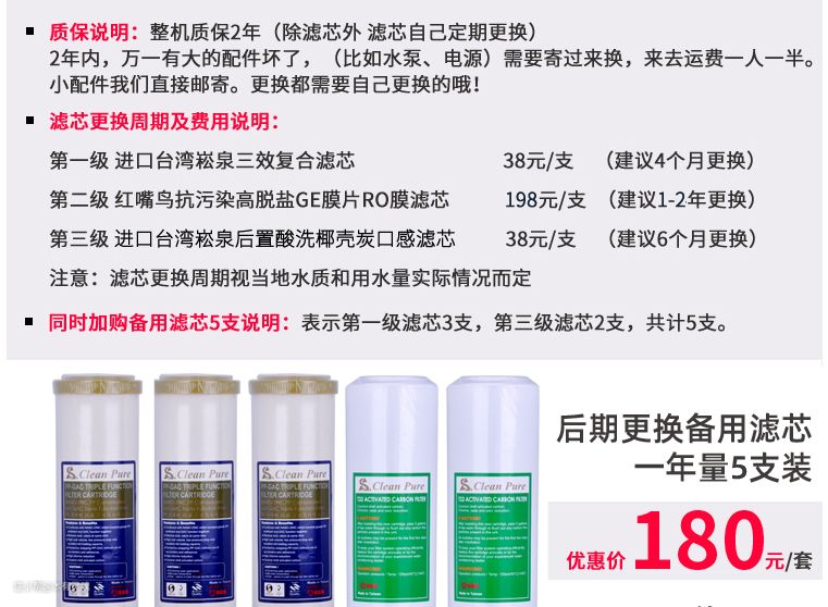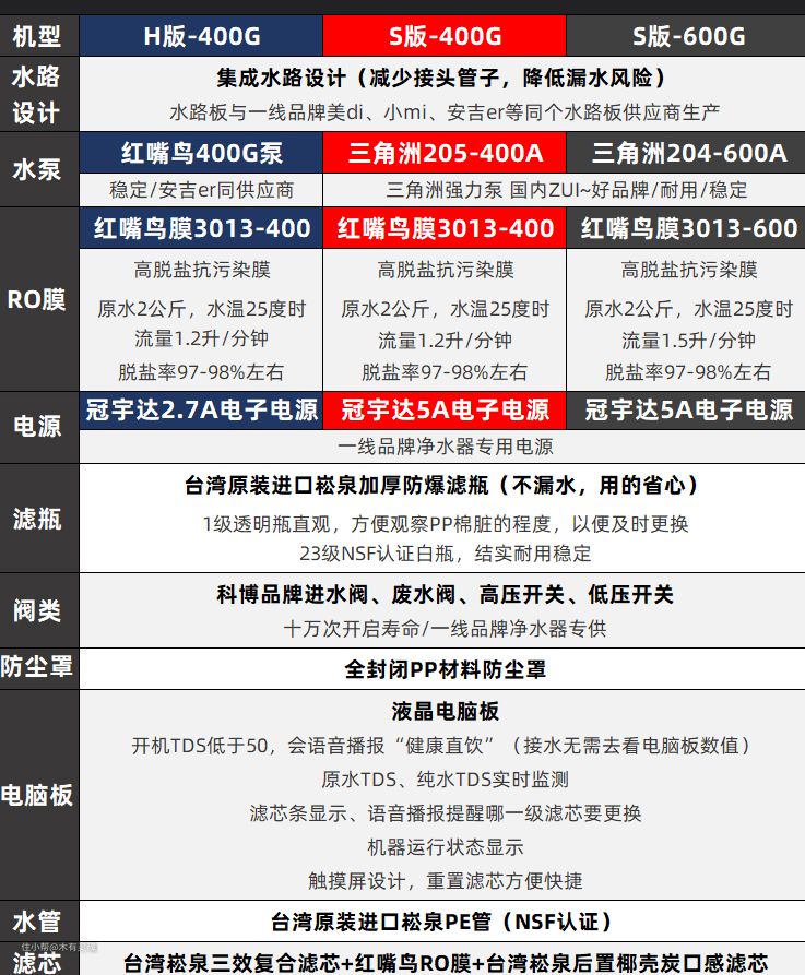 如图,2020款的整体用料。松泉的滤芯和滤瓶都是顶级的,而RO膜其实就是自家装的GE膜,当整体年更换成本在180左右,相比各类品牌还是很有性价比。