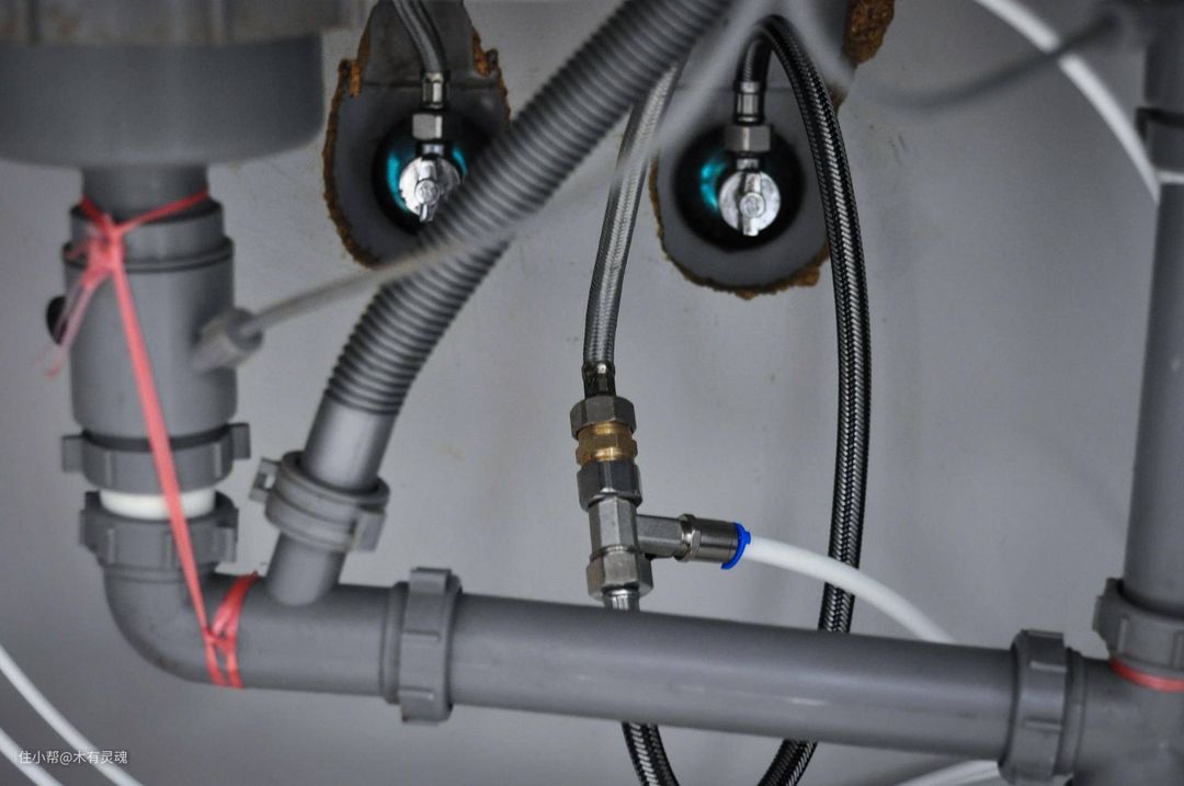 整个安装完全可以靠脑补推演,毕竟水的流向很清楚,唯一有点挑战的是从里面往外接三通时要把线路接口想清楚。上次师傅安装的时候安全卡扣没按压到位,后来差点漏水,这次我特意用力一按,整个卡牢特别稳。