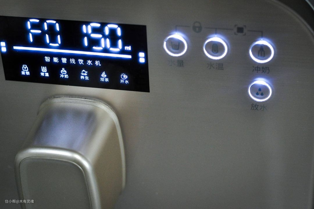安装起来难度特别小,几个膨胀螺丝上墙的事儿。面板在没进水前就点亮了,水量多档选择,水温则覆盖了从冲奶粉的40度到100度五大档位,还特别做了冲奶功能,太体贴奶爸了。