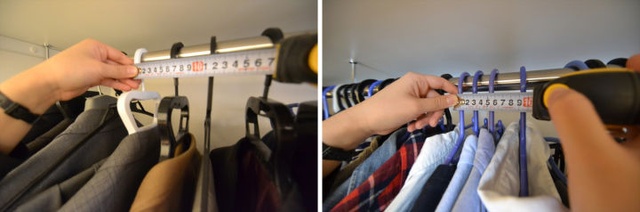 挂衣服时排得太密,衣服彼此挤压容易产生褶皱,也不便于拿取。为了使挂起来的衣服处于舒展的状态,而且方便我们拿取,较薄的衣服之间间隙控制在2.5cm左右,较厚的衣服间隙控制在5cm左右是比较合适的(以衣架之间的间隙为准)▼