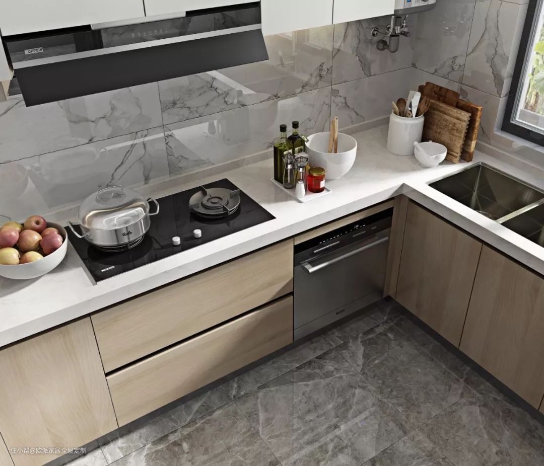 欧派橱柜的食品级石英石台面,石英石含量高达90%~93%,不容易断裂和渗色,而且能抵抗多种污渍,平时清洁非常轻松~