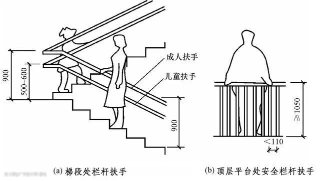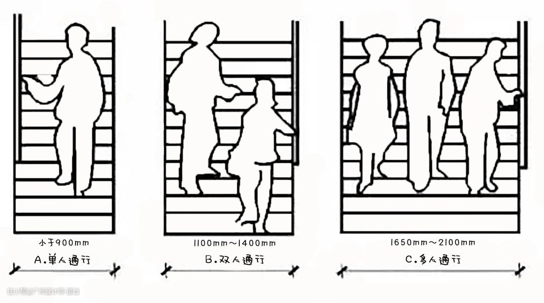 楼梯段宽度是指墙面至扶手中心线或扶手中心线之间的水平距离。一般室内扶手高度取900mm,托幼建筑中扶手高度一般取600mm设扶手,顶层平台的水平安全栏杆扶手高度一般不宜小于1000mm,栏杆之间的水平距离不应大于120mm,室外楼梯扶手高度不小于1050mm。