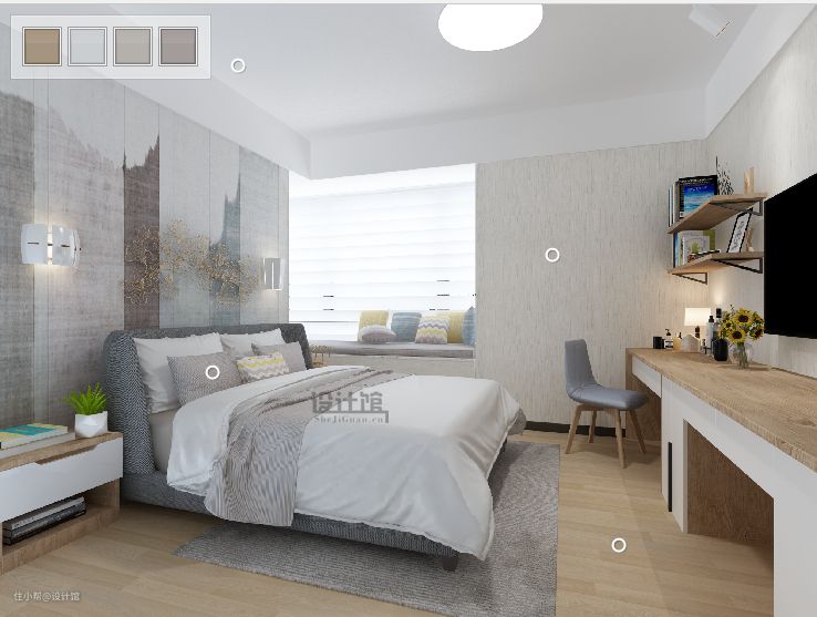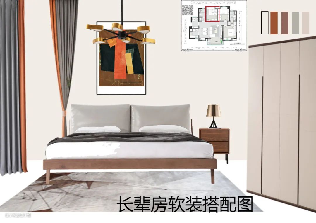 比如我遇到很多买了精装房的客户,开发商铺好的木地板都是非常深的,但是客户又不想花钱更换木地板,这样就需要结合空间搭配软装来尽量达到视觉上的平衡了。下面是我前段时间做的一个精装房软装案例,分享一下我的设计思路。