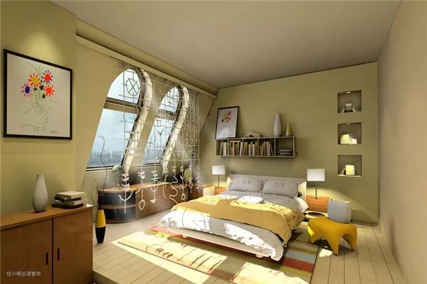 色彩搭配:阁楼采光条件是有限的,所以不宜搭配太深沉的颜色,可以采用简洁明快的颜色,能使整个空间更加明亮,而阁楼的尖顶、斜面、不规则的建筑特点可以加以利用,这样更能体现出空间的创意。