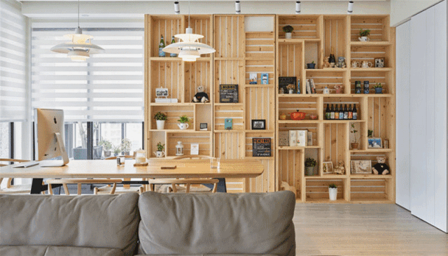 比如:书架、电视墙、置物架、展示架等地方,都可以将门隐藏得“天衣无缝”,从视觉上扩大空间,增加居室的趣味性和实用性。