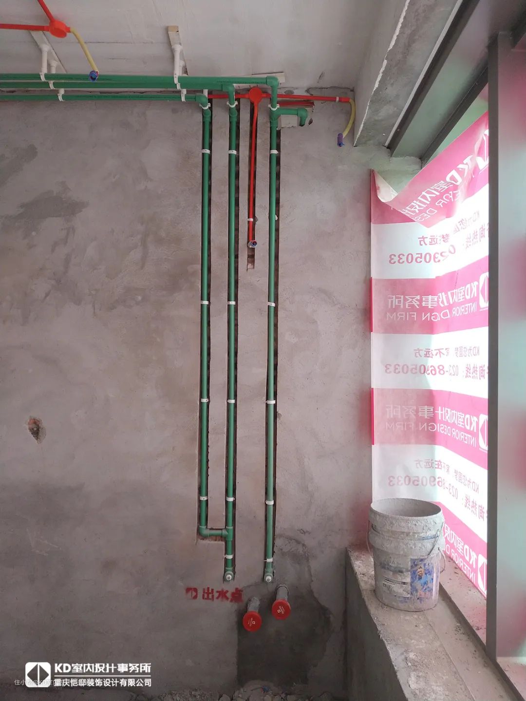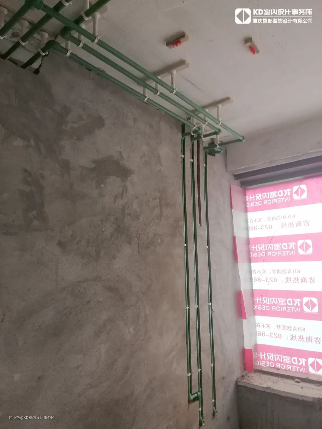 水管走天,安装水管时注意与墙面产生一定距离,并固定此距离,此为KD高端系列施工的特色之一。多管共存,冷热水管、地暖管整齐有序的排列,并新增出水点标识。