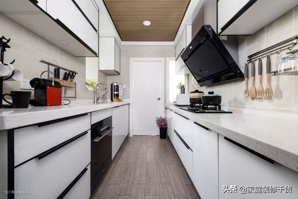 “二”字型的厨房空间更大,完全可以不用挤在一起了,水槽与炉灶可以一边一个。