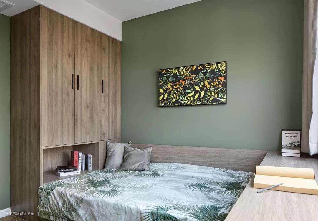 次卧也被作为一个工作区来使用,在靠窗的位置做上了长书桌,榻榻米加上衣柜的组合式设计,让空间被有效的利用起来。