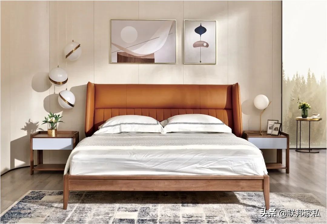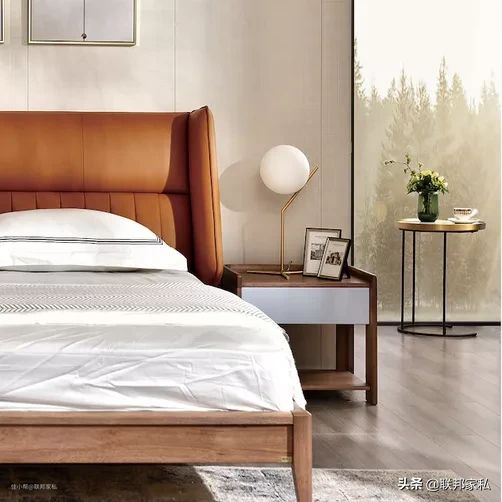 主卧的色彩基于克制的变化,以稳定的暖灰色系为主,家具的造型轻薄又有立体感,核桃楸木+真皮软包+金属线条的装饰,更显空间精致。