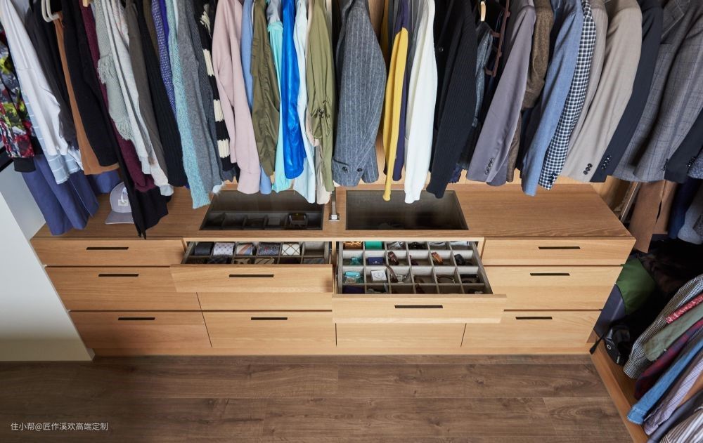 衣柜下方一般常会做抽屉设计,常见的有16公分、24公分、32公分等,分别适合收纳内衣裤、T-Shirt、冬衣或厚重衣物,并可以依照个人需求作调整。