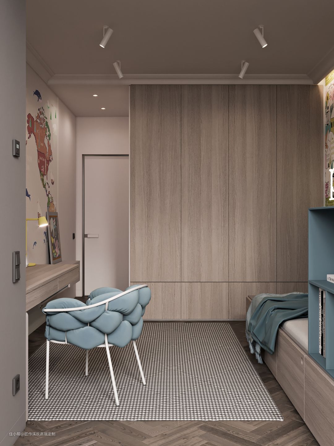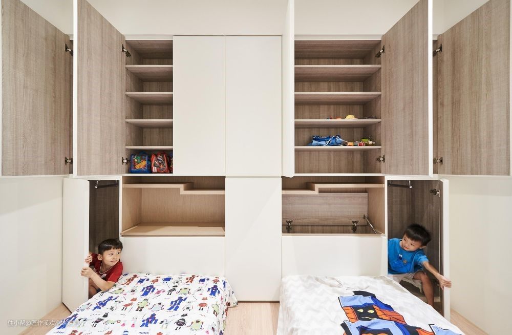 小朋友长大的速度很快,因此建议以一般尺寸制作即可,内部以活动式层板或抽屉方便未来的调整。且因为小朋友的身高较矮,收纳衣物位于下方较合适,才能方便他们教导孩童自己拿取与收纳。