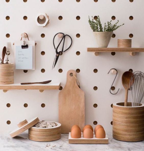 木质的洞洞板甚至可以自己DIY,买一块原木板,定好孔的位置,然后上开孔器打洞,最后用膨胀螺丝固定到墙上,装上从淘宝上买回来的圆木棍,就可以了。