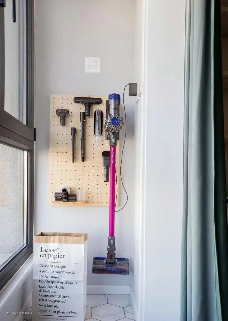 这个时候,你可以考虑在阳台、储藏间、储物柜、家政区、甚至是门后,找一块地方挂上洞洞板,把这些家务工具好好排列整齐。