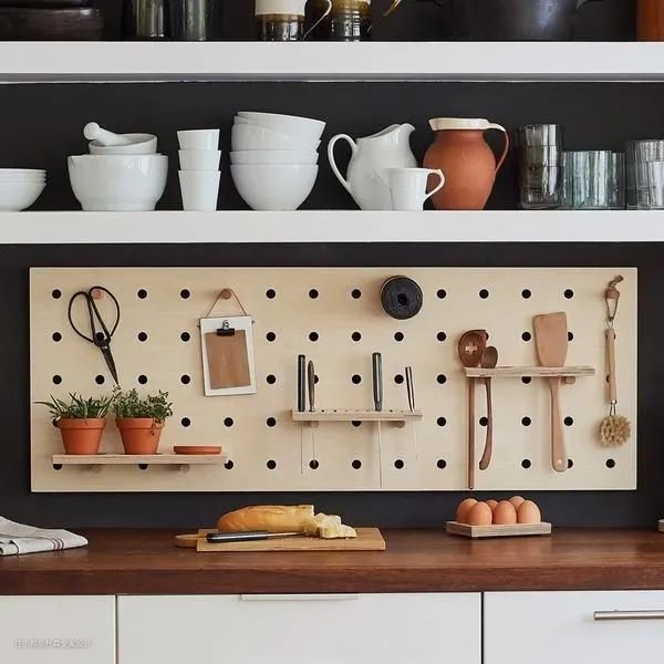 厨房里零零散散大大小小的东西太多了,安装一个洞洞板,可以把各种铲子、勺子、刀具等物品挂上去,解放台面空间