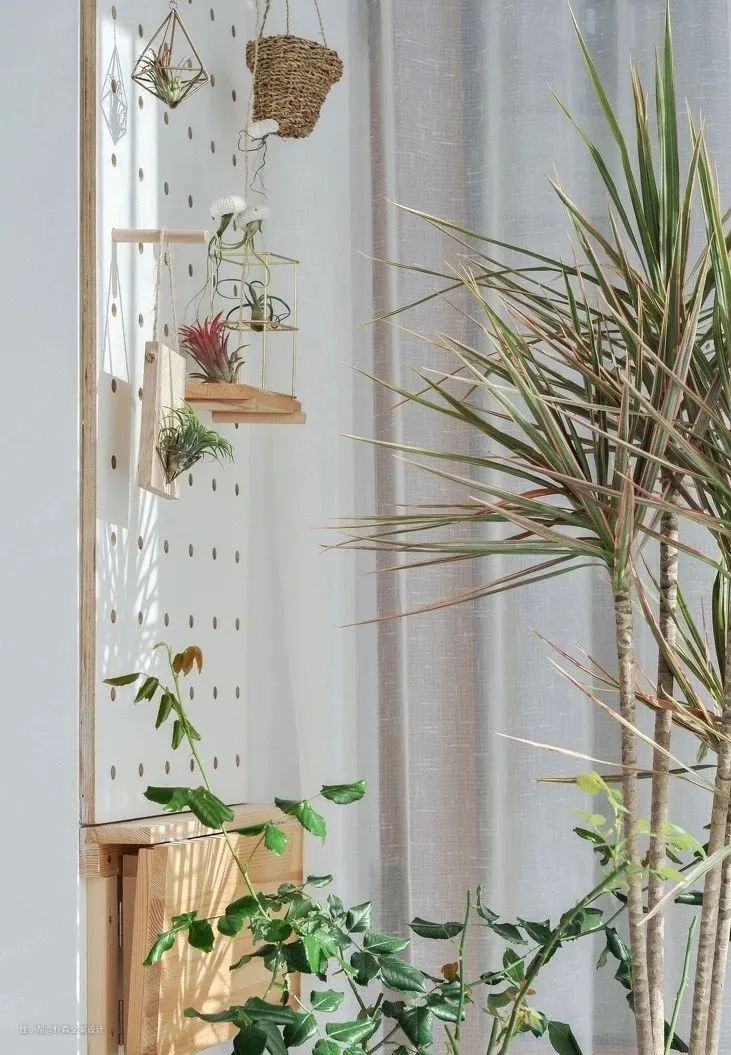 不管是生活阳台,还是休闲阳台,都可以在墙面上留一块地方给洞洞板,你可以挂一个盆栽,也可以放一些其他的装饰。甚至是一些园艺工具,都可以挂上,既整洁有序,又拿取方便。