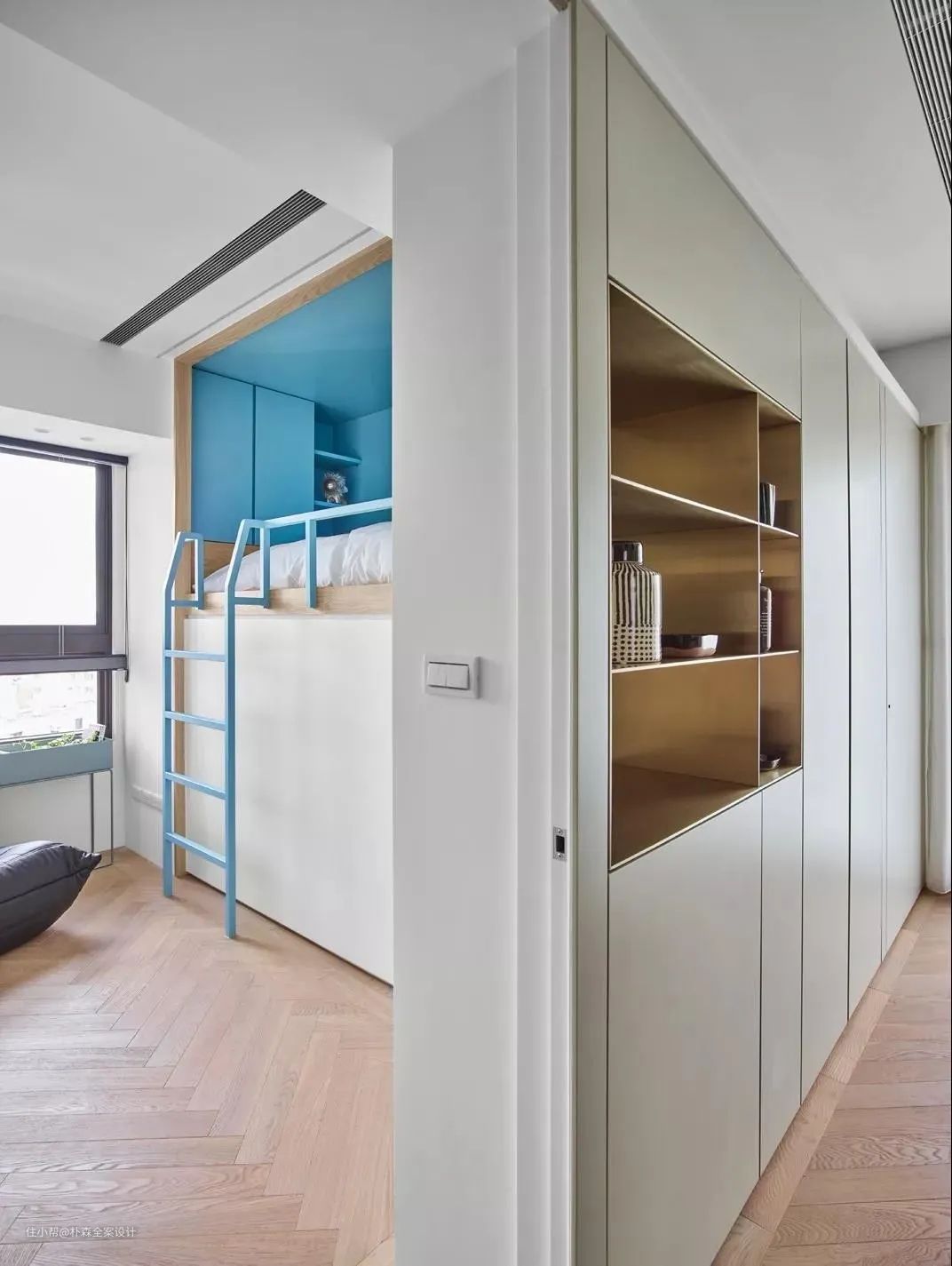 为了满足兄妹两人的日常居住需求,设计师将一个卧室一分为二,左侧上铺为哥哥的房间,右侧下铺为妹妹的房间,彼此相互独立,可以从5岁住到20岁。