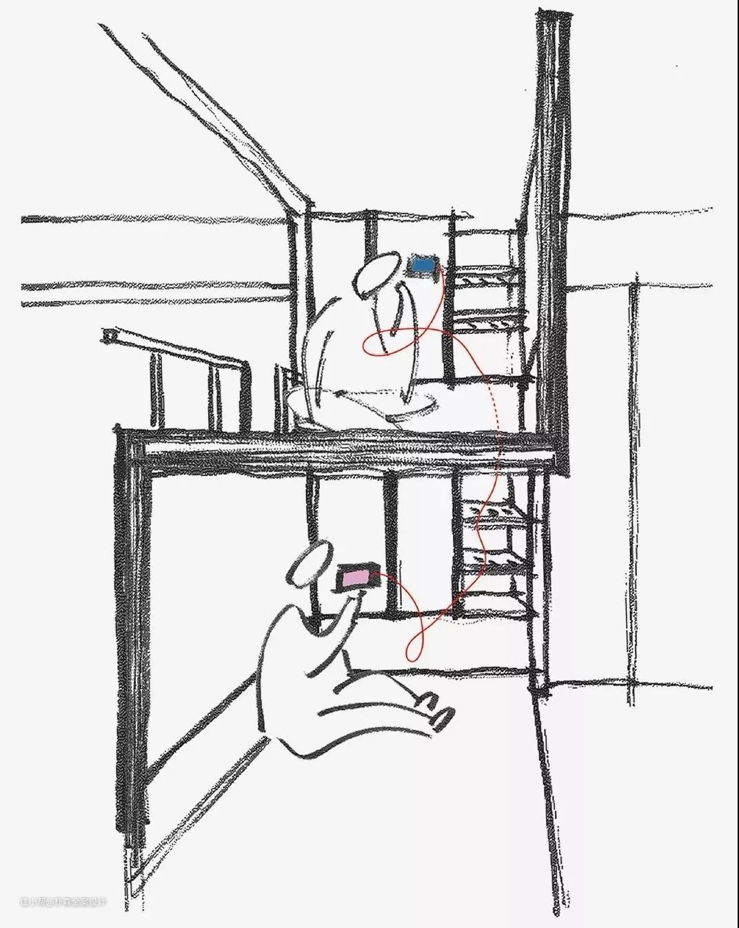 为了让兄妹两睡前也可以说悄悄话,设计师在两张床之间设计了洞洞板,通过传声筒分享彼此的小秘密。