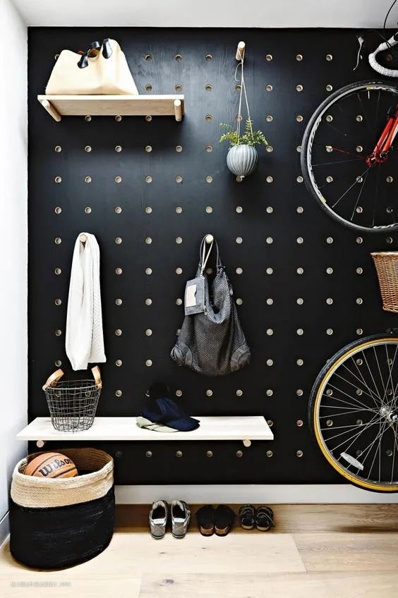 挂上一块洞洞板,日常的包包、钥匙、太阳镜、雨伞,甚至是自行车,都能挂上去