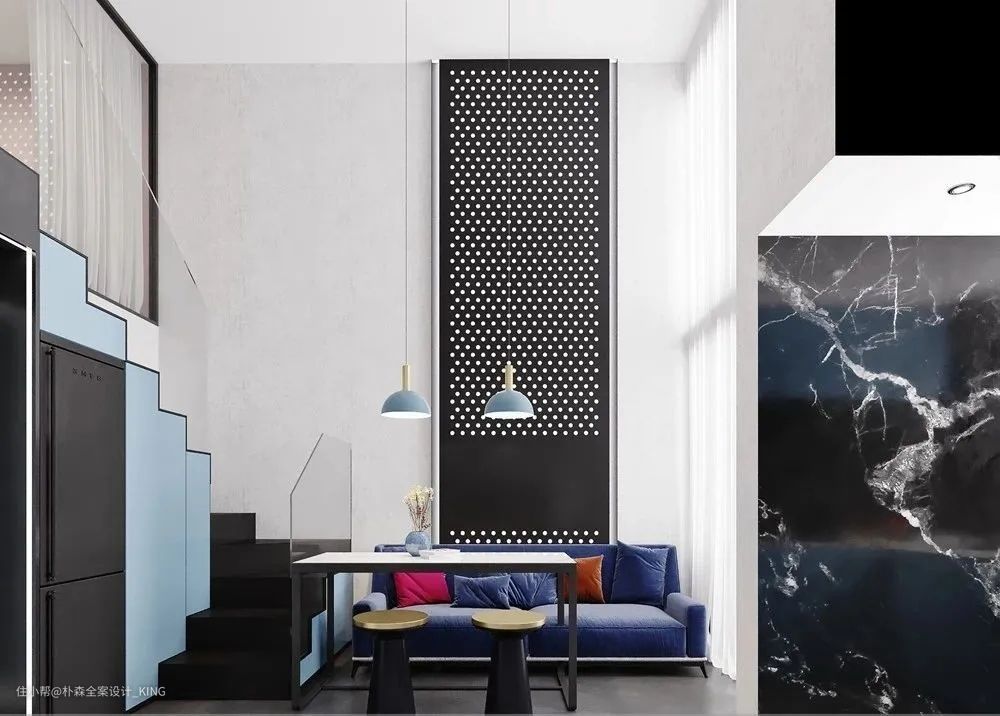 客厅背景墙那么大面积,如何利用?可以选择装一整面墙的洞洞板,通过灵活挪动小圆柱的位置,调整收纳空间
